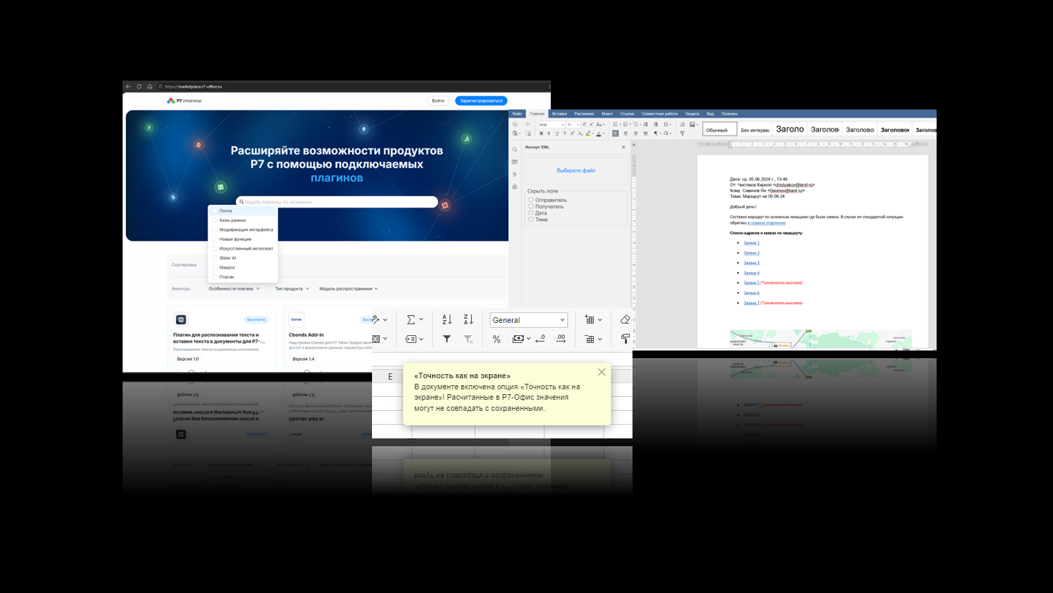 Иногда в формате плагина могут быть реализованы отдельные полезные мини-функции, особенно если они запланированы к реализации, но пока находятся в стадии доработки. Например, отображение предупреждения о том, что в табличном документе включена опция «Точность как на экране» (при этом рассчитанные в редакторах «Р7» значения могут не совпадать с сохраненными). Тут пригодится плагин PrecisionAlert.