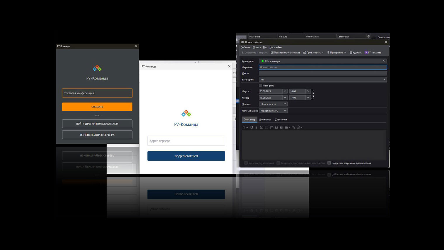 Корпоративная среда коммуникации должна быть насколько возможно единой и удобной. Только так можно обеспечить эффективное планирование и продуктивную совместную работу, сократить время на организацию встреч и совещаний, обеспечить безопасное соединение с серверами и соответствие корпоративным политикам. В решении всех этих больших задач помогает небольшой плагин, который обеспечивает интеграцию между приложениями «Р7-Команда» и «Р7-Органайзер» (Базовый и ПРО). С его помощью пользователи могут создавать группы для совместной работы и общения прямо из календаря «Органайзера», без необходимости вручную переходить в другие приложения. Плагин автоматически подставит ссылку на группу и описание приглашения в карточку события.
